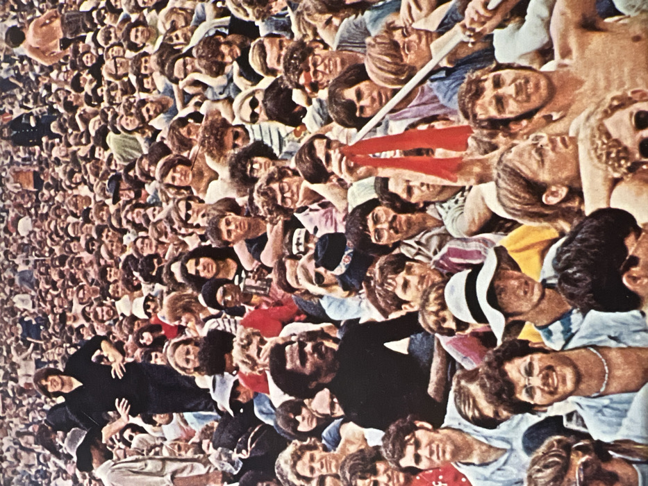 The image depicts an extremely dense outdoor gathering of a large crowd in the city of Plaisir, France, suggestive of a festival or concert setting. The scene is filled with individuals, primarily young adults, packed closely together across the entire frame, extending into the distant background as a mass of heads and shoulders. In the foreground and midground, numerous people are visible in various states of attention or interaction. Many individuals have long hair, consistent with late 1960s/early 1970s fashion. Attire is casual, including short-sleeved shirts, button-downs, and some individuals are shirtless. Various accessories like sunglasses, hats (including a white and black striped bucket hat), and a beaded necklace are present. Specific individuals of note include: - A man in the lower-center foreground, with a goatee and glasses, wearing a light blue shirt and a beaded necklace, smiling slightly towards the viewer. - To his left, a man wearing a white and black striped bucket hat, looking forward. - To his right, a shirtless man with a beard and short hair, looking slightly left. - Slightly above center-left, a Black man with a mustache, wearing a dark turtleneck shirt, looking towards the right. - In the midground, towards the right, a man holds two pieces of red fabric aloft with his right hand. Adjacent to him, another man holds a long, light-colored pole or staff diagonally across the frame. - In the upper midground, a man stands prominently, hands on his hips, wearing a dark long-sleeved shirt and jeans, looking towards the left. To his left, another man in a light shirt and hat converses with him. The environment appears to be an open field under natural daylight. The immense scale of the crowd is a dominant feature, with no discernible structures or natural landmarks visible beyond the people themselves.