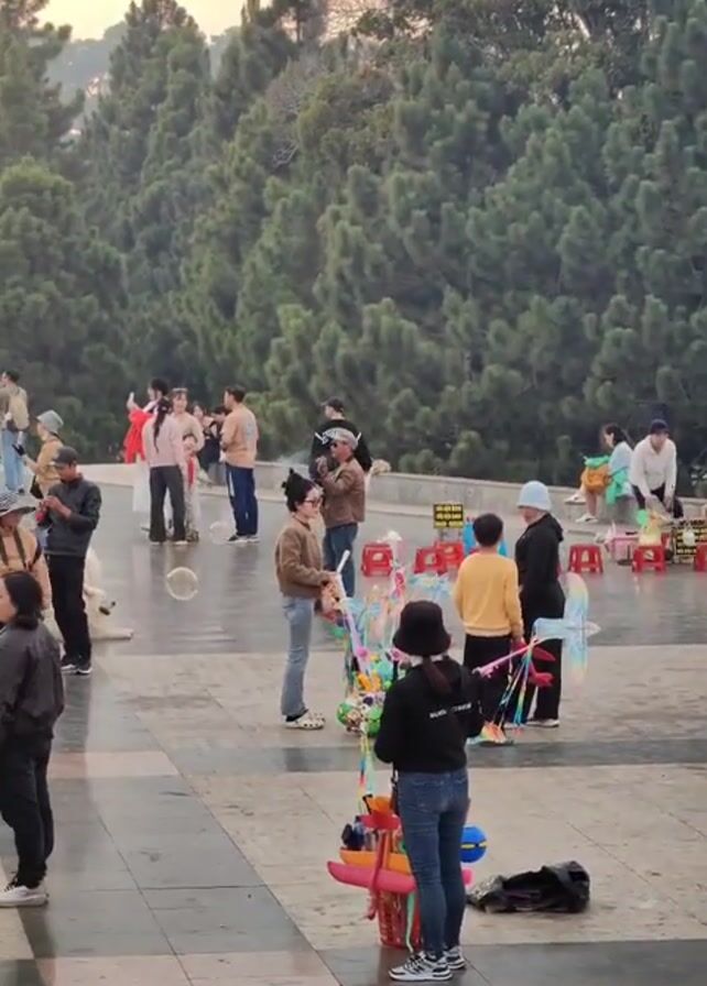 The video depicts an outdoor scene with a paved plaza surrounded by tall evergreen trees in the background. The sky appears overcast. There are numerous people present, many of whom seem to be leisurely strolling or standing around. Children can be seen playing. A vendor, identifiable by the colorful array of toys and trinkets displayed on a stand, is visible in the foreground. Several dogs are also present, adding to the lively ambiance of the scene. A few people appear to be taking photographs.