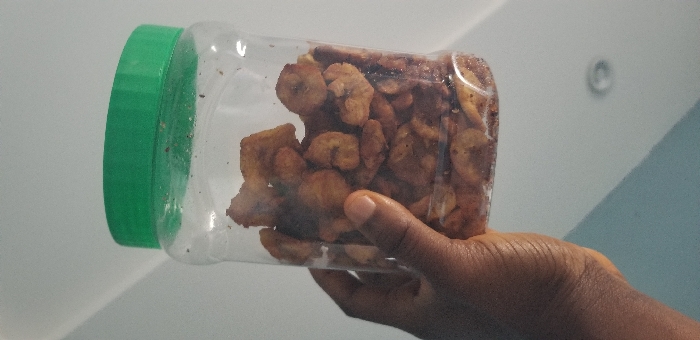 - "A dark-skinned right hand is observed gripping a clear, cylindrical plastic jar approximately three-quarters full of golden-brown, irregularly shaped fried plantain chips (kpekere)" by FM-qh4EW2, licensed under CC BY 4.0