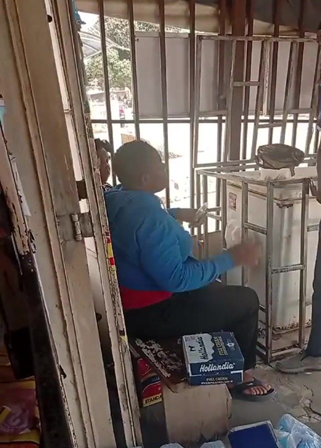 Here's a detailed description of the video: The video appears to be shot inside a small shop or store, likely in a warm climate, as suggested by the casual attire of the people. In the initial scene, a woman is seated on a low stool or box (a case of Hollandia brand product) inside the shop. She's wearing a blue hoodie over a red top, with black pants and sandals. A man in a blue t-shirt with the words "Dairy Power" stands near her, holding what seems to be money or papers. The shop has metal bars as part of its structure. Bags filled with liquid (presumably water or drinks) are visible on the floor. The man walks away toward the back of the shop. In the following sequence, the camera focuses on two women walking away from the shop. One woman is wearing a red and black patterned dress. Another woman in the background wears a blue top and red shorts. A white van with "Chivita" branding is parked outside. The environment around the shop appears to be an outdoor area with what looks like a street or walkway, as the van is parked there. There are additional crates and stacked items visible outside the shop.