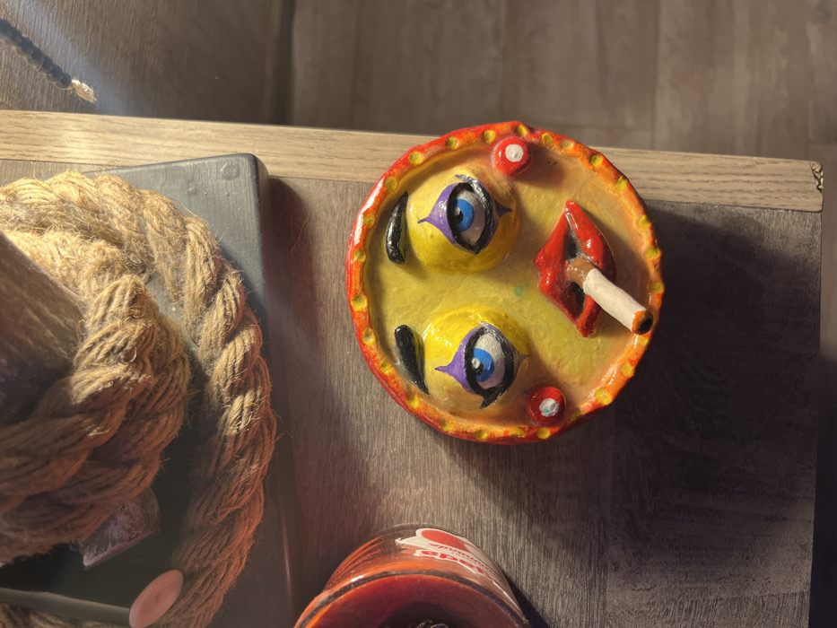 A top-down shot showcases a whimsical, circular ashtray. Two yellow, stylized faces with large blue eyes and black accents sit in the yellow base. Red lips hold a lit cigarette. The ashtray has a colorful red and orange rim dotted with red beads. It is placed on a wooden surface beside a tightly coiled rope with a dark gray base. Part of a red container is also visible at the bottom.