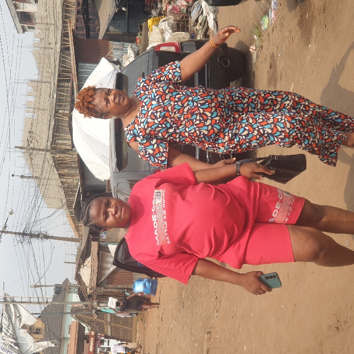 This image depicts a bustling street scene in Onitsha, Nigeria, characterized by informal commercial and residential structures under a hazy sky. In the immediate foreground, two adult females walk towards the viewer on an unpaved, dusty road. The woman on the left, appearing pregnant, wears a red t-shirt and matching red shorts, both bearing white text that reads "MADE-Q... BATTLE KID HOUSE." She holds a light blue smartphone in her left hand and a black handbag in her right. Her hair is braided. Beside her, the woman on the right wears a multi-colored patterned jumpsuit with shoulder cut-outs, featuring red, blue, and white teardrop or leaf-like shapes on a dark background. She has reddish-brown curly hair and wears a gold-colored bracelet on her right wrist. Behind these individuals, a black SUV is parked with its rear driver-side door open. A white umbrella or canopy is visible above the vehicle's roof. To the far left, a person in dark clothing carries an item on their head, walking away from the foreground. Further back on the left, another individual carries a blue bag. The background consists of a dense urban environment. On the left side of the street, a partial sign reading "JERIAKU CH..." is visible above informal shops or residences constructed from corrugated metal and other materials. Further down the street, various people are discernible. The right side of the street features accumulated refuse, including white sacks and miscellaneous debris, against a backdrop of more corrugated metal structures. Overhead, numerous tangled electrical wires crisscross the sky, attached to utility poles. In the mid-ground, several unfinished concrete buildings with exposed rebar are visible, suggesting ongoing construction or disrepair.