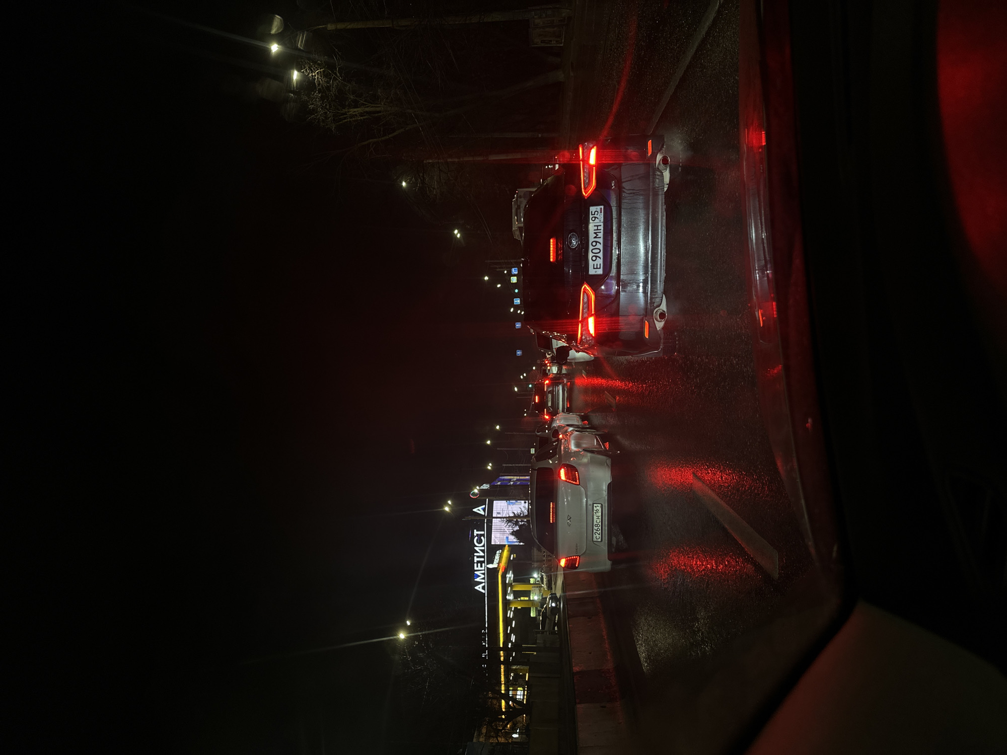 The image depicts a nighttime scene of a street in Rostov-on-Don, Russia, experiencing a traffic jam. The view is from inside a car looking forward. A sign for the "AMETIST" shopping center is visible on the left side of the street, illuminated by bright lights. Cars are lined up ahead, with their brake lights on, indicating stopped or slow-moving traffic. The road surface appears wet, reflecting the lights from the vehicles and street lamps. Russian license plates are visible on the rear of the cars. Street lights are present along the road. The general environment is dark and urban.