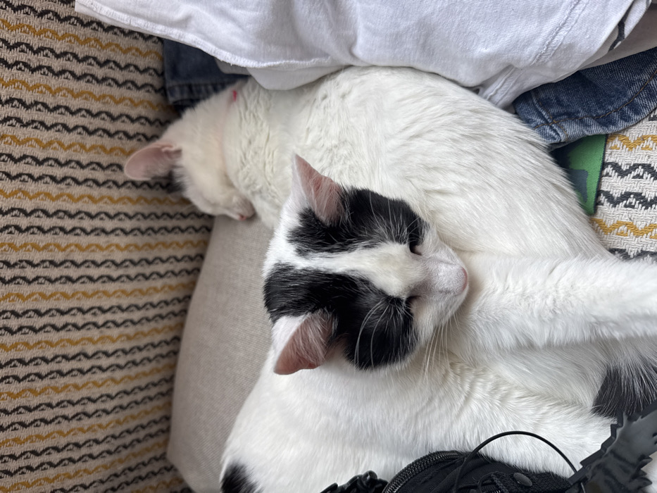 This image depicts two domestic cats resting indoors in what appears to be a residential setting within the city of Sofia, Bulgaria. The primary subject is a predominantly white cat with distinct black markings on its head, including patches around both eyes, ears, and forehead, creating a "V" shape, and a black spot visible on its back. This cat is positioned in the foreground, facing slightly downwards with its eyes closed, indicating sleep or deep rest. Its right foreleg is partially visible, curled under its body. Behind and slightly to the right of the foreground cat, a second cat, entirely white-furred, is also resting with its eyes closed. A thin, bright pink collar is visible around its neck. Its head is turned away from the viewer, nestled against a light beige cushion. Both cats are lying on this light beige cushion, which is situated against a textured fabric background featuring a repetitive pattern of wavy horizontal lines in black and yellow/gold on a lighter base. To the right of the cats, a stack of clothing or fabric is visible, including a section of blue denim material (possibly jeans) and a piece of white fabric (possibly a t-shirt). A black object, possibly a zippered bag or part of a harness, is partially visible on the far left edge of the frame, resting next to the foreground cat. A small section of green fabric with a darker pattern is visible beneath the cats, between the cushion and the patterned background. The scene suggests a quiet, comfortable environment.