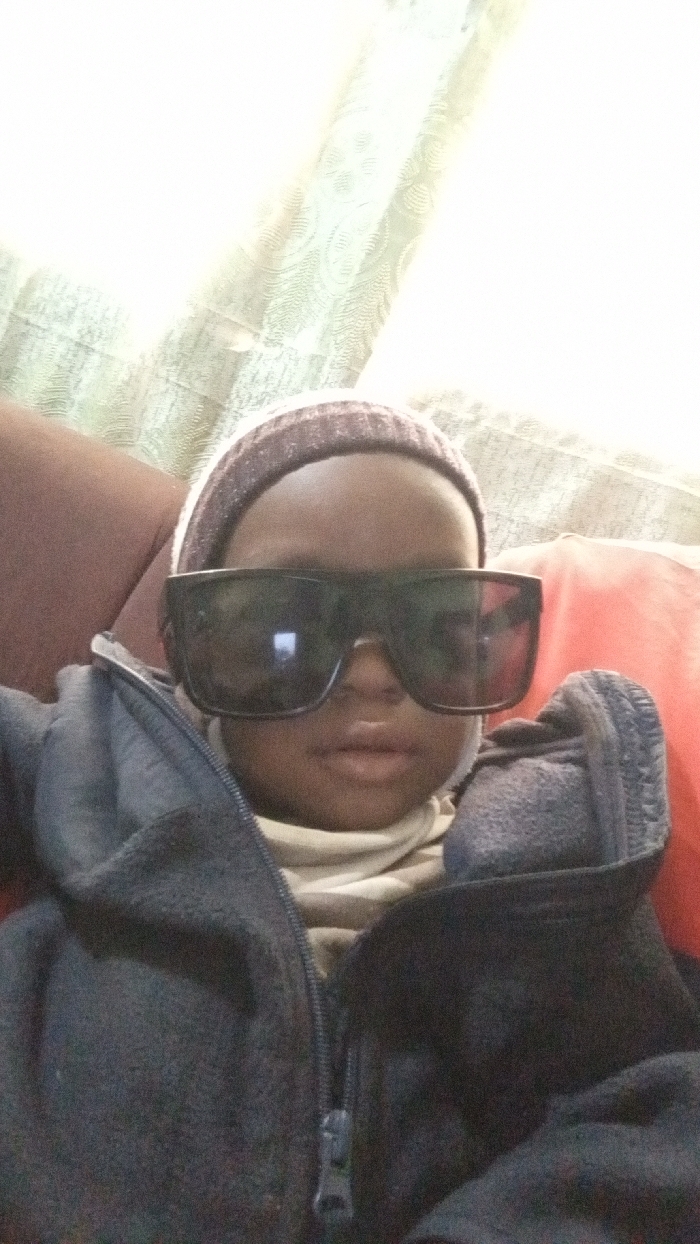 An individual, appearing to be a child or infant, is depicted in a medium close-up, seated or reclined against soft furnishings in an indoor setting in Unguwan Dosa, Nigeria. The subject has dark skin and is wearing a light brown knit beanie, oversized black rectangular sunglasses with prominent reflections, a cream-colored high-collared garment, and a dark grey zippered fleece jacket that is partially open. To the subject's left is a reddish-brown upholstered surface, and to the right is an orange cushion. The upper background features a brightly lit, light-colored fabric with a visible embossed or woven pattern, likely a curtain.