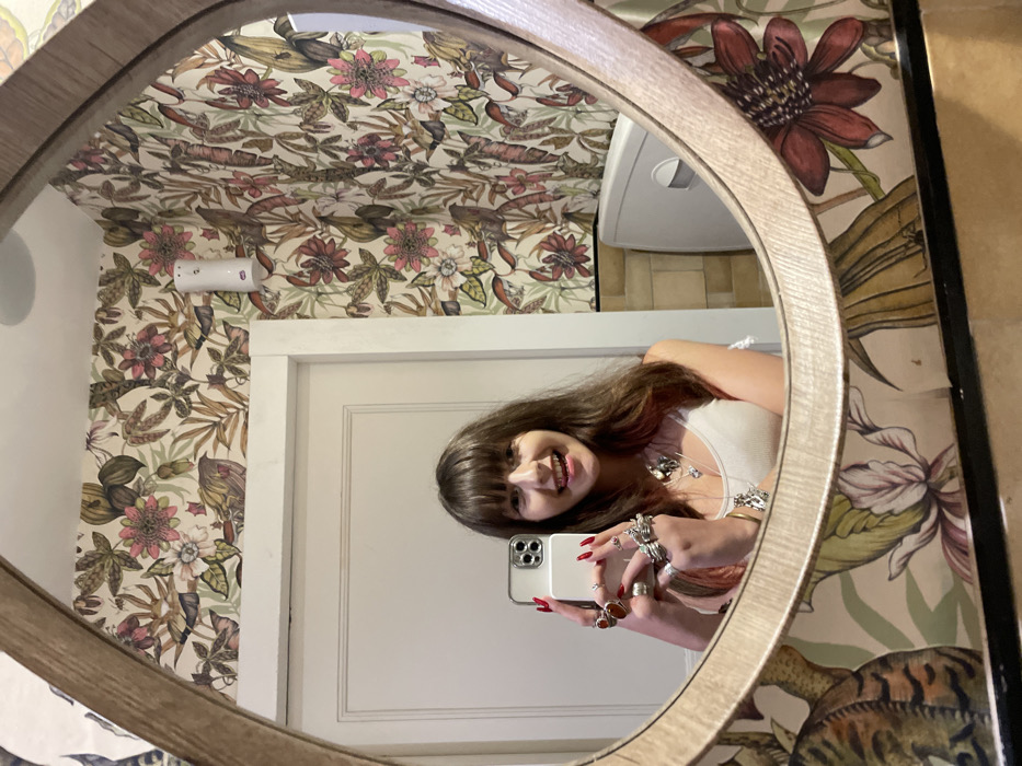 A young female is depicted in a mirror selfie taken in a restroom located in Hod HaSharon, Israel