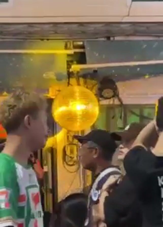 crowded outdoor bar scene at night, illuminated by a bright gold disco ball. Several people are visible in the foreground, including one wearing a green and white 7-Eleven shirt. A man in a black shirt raises his arms. The disco ball hangs above the crowd, reflecting light in all directions. Cables and other equipment are visible in the background, along with parts of a building facade. The overall atmosphere seems lively and celebratory.