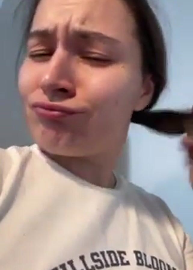 A person wearing a white t-shirt with the words "HILLSIDE BLOOM" printed on it is shown close up. The person has dark hair pulled back into a ponytail. They are looking into the camera with a slight frown on their face, then puckering their lips. The background is a plain light blue wall. The camera angle is slightly tilted upwards.