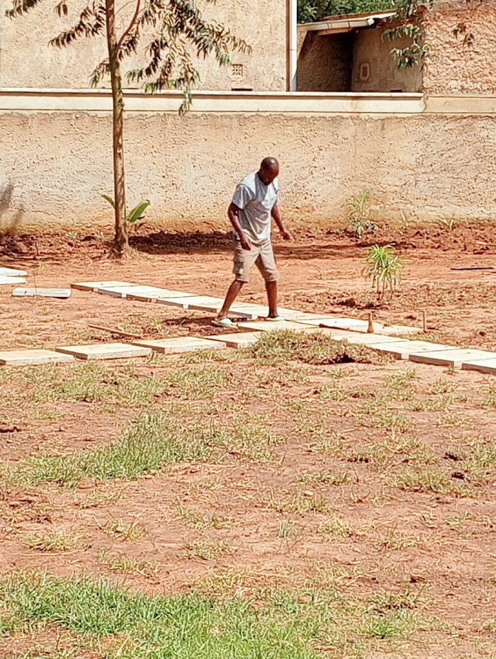 The image depicts an outdoor scene in Lumakanda ward, Kenya. A single adult male, bald with dark skin, is centrally positioned. He wears a light grey t-shirt, light brown shorts, and light green flip-flops. He is bent slightly forward at the waist, looking downwards, with his arms slightly bent and held away from his body. He stands on or near a path composed of light-colored square paving stones arranged linearly on the ground. The ground consists predominantly of reddish-brown soil with sparse patches of green grass and small plants. To the left, a young tree with green leaves is visible behind the path. In the background, a textured, light brown wall spans the width of the frame. Beyond the wall, parts of two structures are visible, including a building with a light-colored wall and a dark roof. The scene is illuminated by bright daylight.