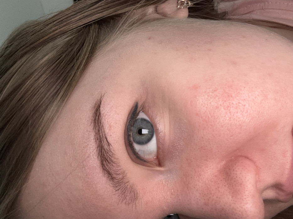 A high-resolution close-up image features the right side of a human face, primarily focused on the right eye, part of the nose, and cheek. The subject's right eye displays a light blue-grey iris with a dark, centrally located pupil reflecting a rectangular light source. A black eyeliner is applied to the upper lash line, terminating in an upward-angled wing at the outer corner. The eyebrow above the eye is dark brown, naturally arched, and moderately thick. The skin has a fair complexion, showing visible pores across the nose and cheek, with areas of subtle redness. Medium brown hair strands are visible along the upper right portion of the frame, near the temple. A small, metallic, looped earring is present on the subject's right earlobe. The image provides no visual information to determine the specific location in the city of Nizhnekamsk, Russia.