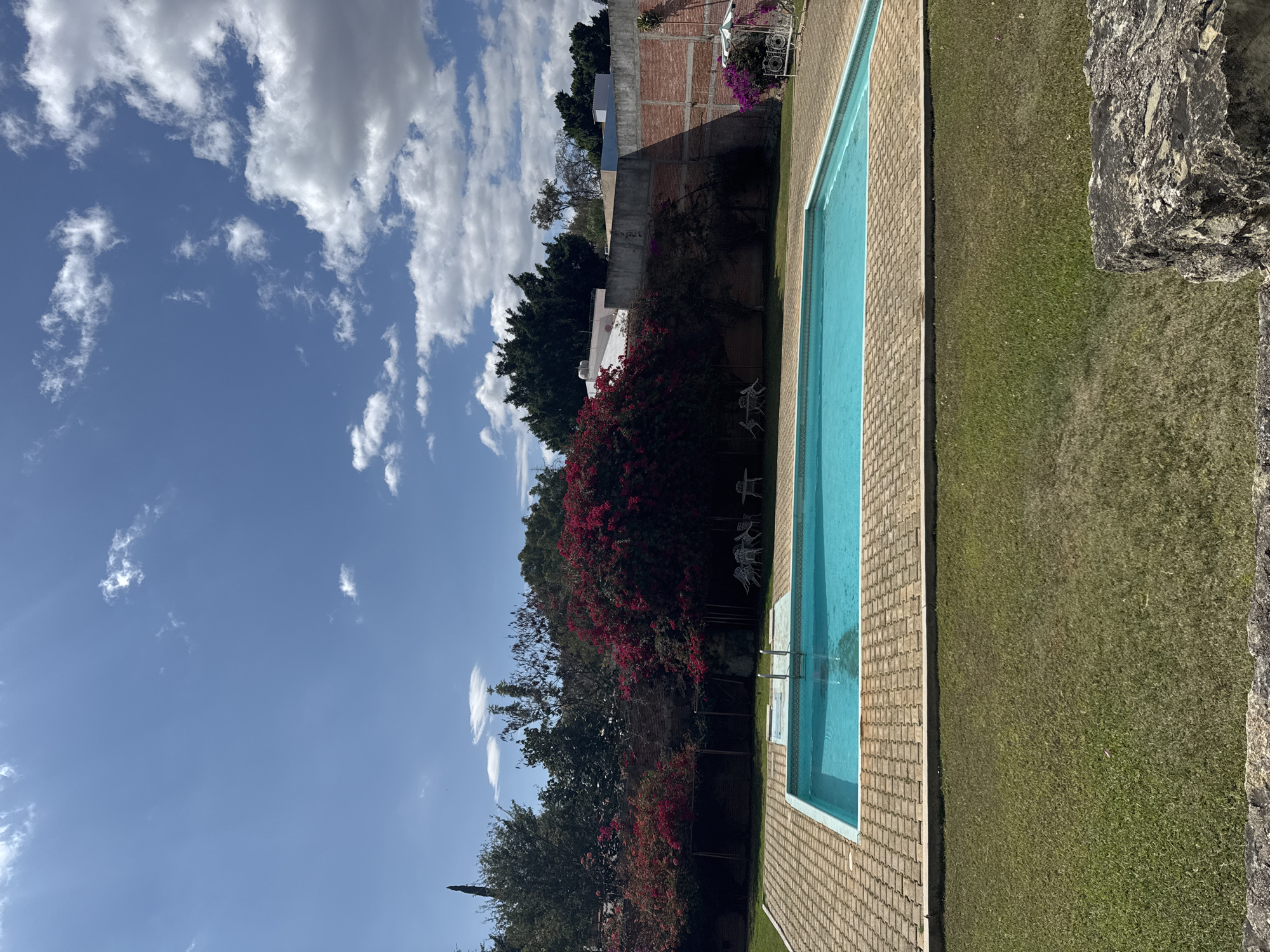 The image depicts a swimming pool area in what appears to be a residential setting, likely located in Oaxaca City, Mexico, given the architectural style and vegetation commonly found in the region. The pool is rectangular, filled with clear, light blue water, and surrounded by a paved patio area constructed from brown bricks. Adjacent to the patio is a well-maintained green lawn. In the background, a tall brick wall encloses the property, with trees and flowering bushes visible along the wall's perimeter, giving a sense of lush vegetation typical of the area. Above the wall, glimpses of other buildings and structures can be seen, suggesting an urban or suburban context. The sky is predominantly blue with scattered white clouds, indicating a sunny day. The image suggests a private outdoor space designed for relaxation and recreation, characteristic of homes or villas in Oaxaca City. There are no people visible in the scene, so the image depicts an environment devoid of human activity.