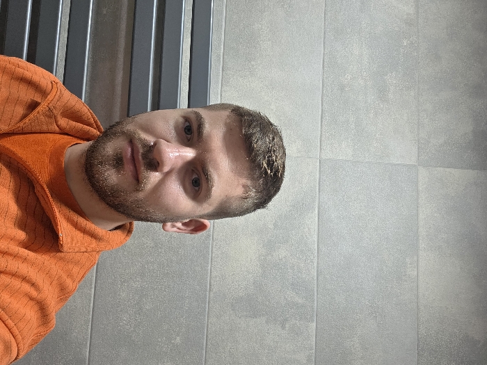 The image displays a male subject, appearing from the chest up, centered against an indoor background. The subject has short, dark hair and a neatly trimmed beard. He is wearing an orange zippered fleece jacket over an orange t-shirt, maintaining a neutral expression while looking directly at the camera. The background consists of a light gray tiled wall, featuring discernible horizontal and vertical grout lines between rectangular tiles. To the left of the subject, a portion of a gray, multi-barred metal object, consistent with a towel warmer or radiator, is visible. The environment is an interior space, likely a bathroom or similar utility area, based on the visible tiled walls and radiator. No specific geographical identifiers for Yagodovo, Bulgaria, are present within the visual content of the image.
