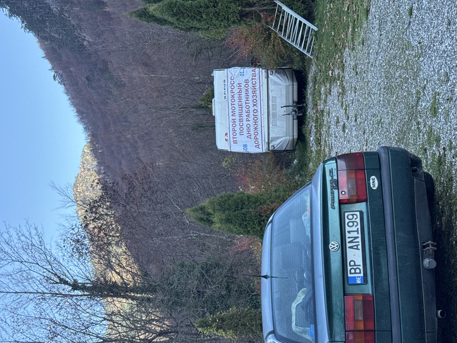 An outdoor scene is depicted in the Bistrica area, Bijelo Polje Municipality, Montenegro, at the base of a forested mountain under a clear blue sky. In the foreground, the rear of a dark green Volkswagen Passat sedan is parked, displaying a Montenegrin license plate "BP AN199" and a tow hitch. Unidentifiable items are visible on the rear parcel shelf through the back window. Behind the car and slightly to the right, a white Adria brand travel trailer is parked. Its rear is affixed with a prominent red-on-white banner featuring Cyrillic text that translates to "SECOND MOTOCROSS, DEDICATED TO JULY 01, ROAD WORKERS' DAY." To the right of the trailer, a silver-colored step ladder rests angled on the ground. The immediate ground surface is composed of gravel and sparse green vegetation. The mid-ground contains several evergreen conical shrubs, along with numerous deciduous trees and bushes with bare branches or reddish foliage, suggesting an autumn or winter season. The background is dominated by a substantial mountain range covered with a mix of sparse bare trees and some evergreens. No individuals are present, and no actions or interactions are occurring.