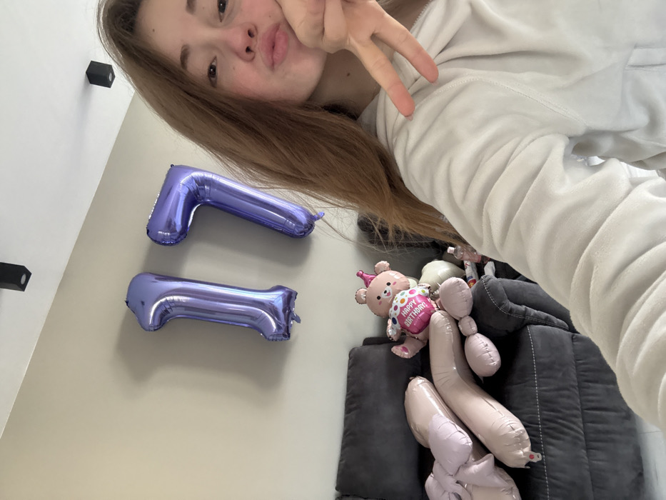 This image depicts a domestic scene, ostensibly in Kipra, Bulgaria, featuring a young female adult within a room decorated for a celebration. A Caucasian female, exhibiting light brown hair, occupies the right half of the frame. She is wearing a light-colored, possibly white or light grey, fuzzy hooded garment. Her right hand is raised to her cheek, displaying a "peace sign" gesture with extended index and middle fingers. Her mouth is pursed in a slight pout. Behind and to the left of the subject, two large, inflated, shiny purple foil balloons in the shape of the numbers "1" and "7" are affixed to a plain, light-colored wall, indicating the number 17. Below these balloons, on a dark grey fabric sofa, several other inflated balloons are present. A prominent balloon in the center depicts a light brown cartoon bear wearing a pink party hat and holding a smaller pink balloon with "HAPPY BIRTHDAY" text. To the left of the bear balloon, a collection of light pink foil balloons, including elongated shapes and one resembling a bow, are arranged on the sofa. A small white cylindrical item and a small pink bottle are also visible on the sofa behind the bear balloon. The ceiling features at least two black rectangular track light fixtures.
