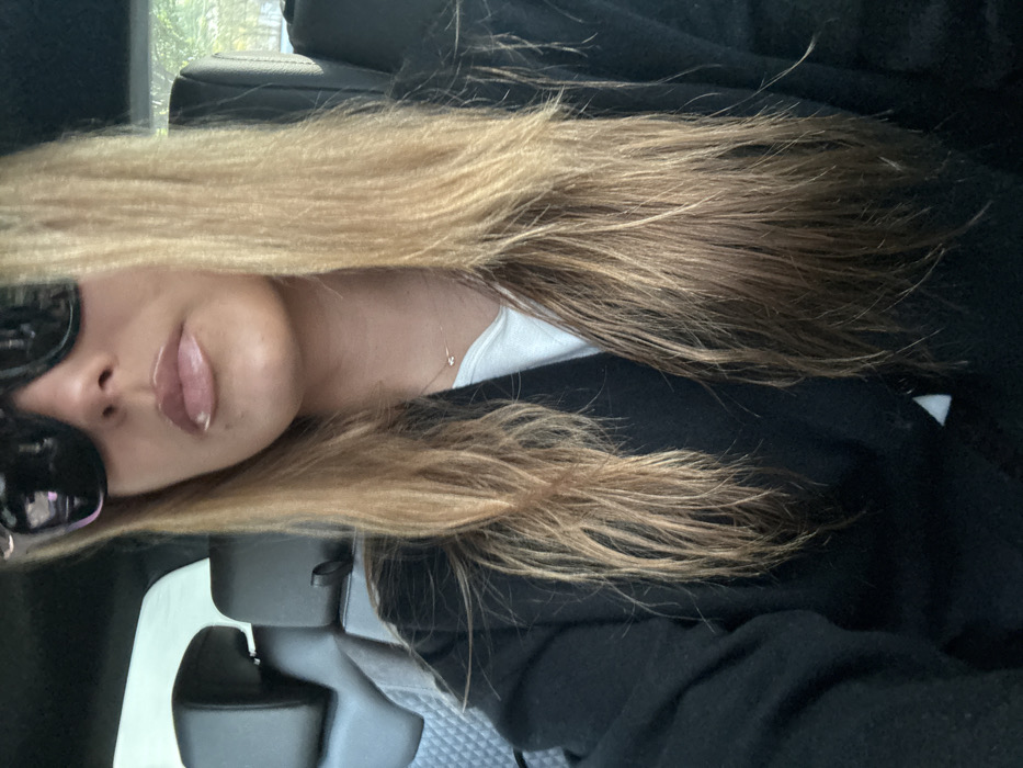 A person wearing dark sunglasses and a black jacket is seated in a car. The individual has blonde hair with darker roots. A glimpse of a white top is visible under the jacket. The car's interior, including part of the dashboard and a headrest, is also visible. The focus is on the person's face and hair.