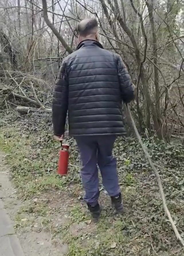 - "A man is walking into the woods, carrying a stick and a red thermos" by FM-1AW5I2, licensed under CC BY 4.0