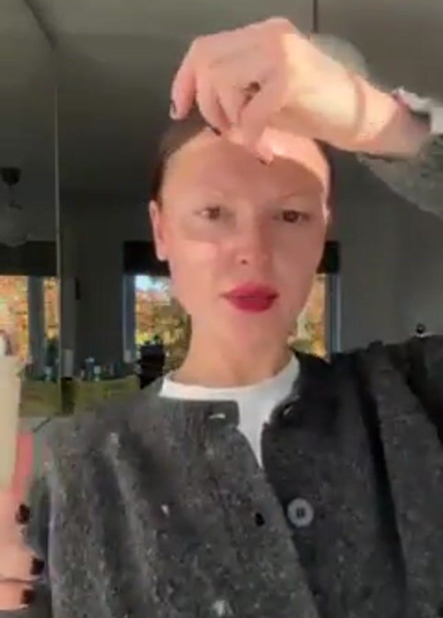 A woman in a gray cardigan and white undershirt preps her face with a light beige bottle of product. She uses the applicator on her face and neck. The woman has red lipstick and a tattoo on her inner left arm. A window is visible in the background.