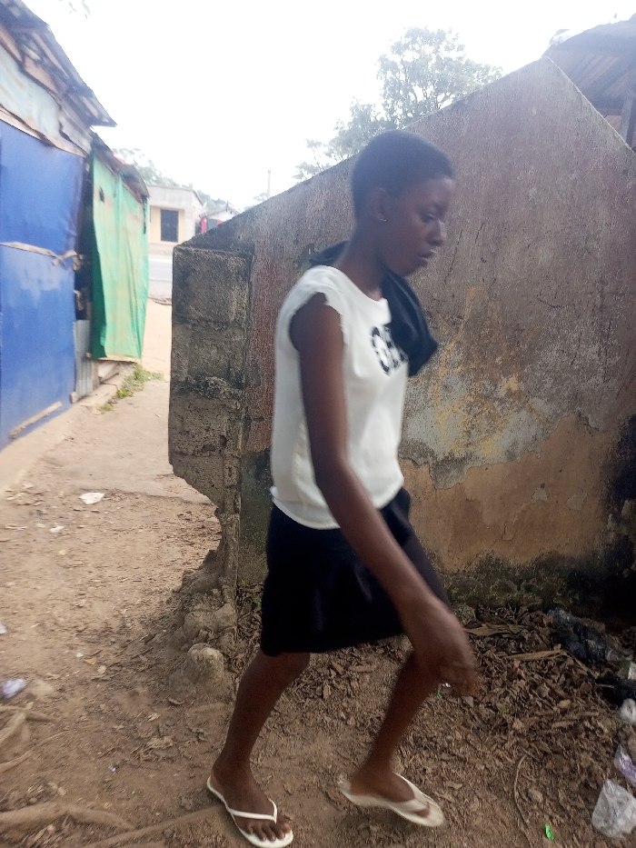 A young female, appearing to be in motion, walks right-to-left across a dirt path in Adankolo, Nigeria