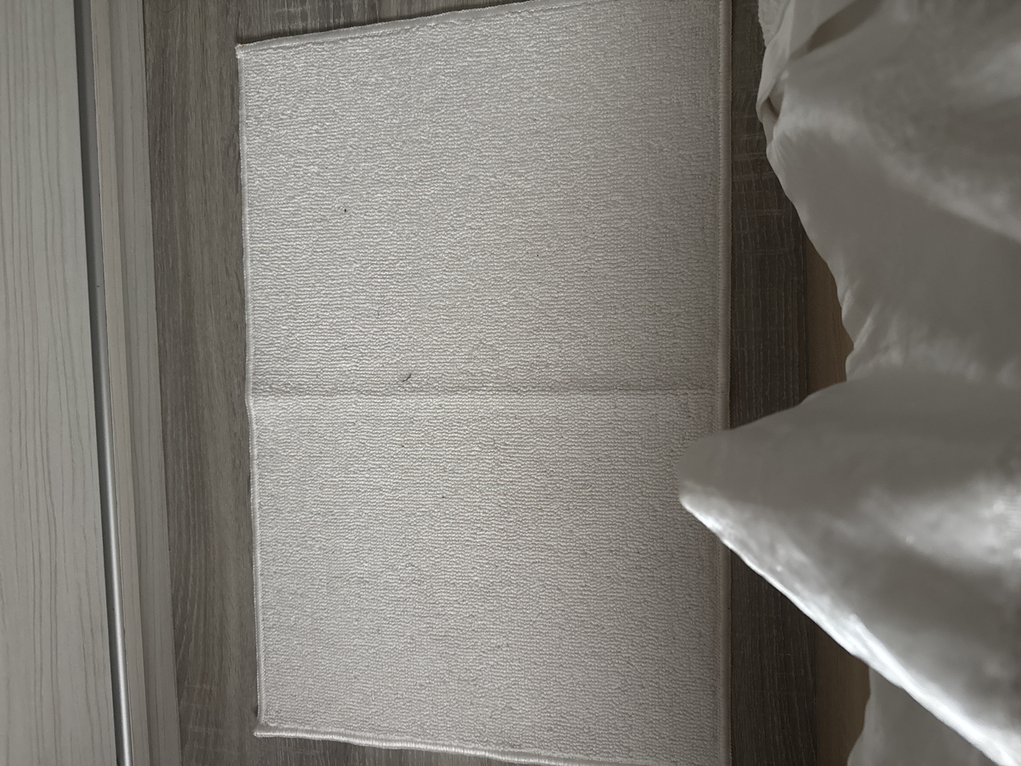 light gray rectangular bath mat placed on a gray wood-look floor. Part of a white curtain or sheet is visible on the right side of the image, obscuring the floor underneath. To the left, a section of a light-colored wooden door or panel can be seen. There's no information to confirm the location is Silistra, Bulgaria. The image contains no people, actions, or interactions.