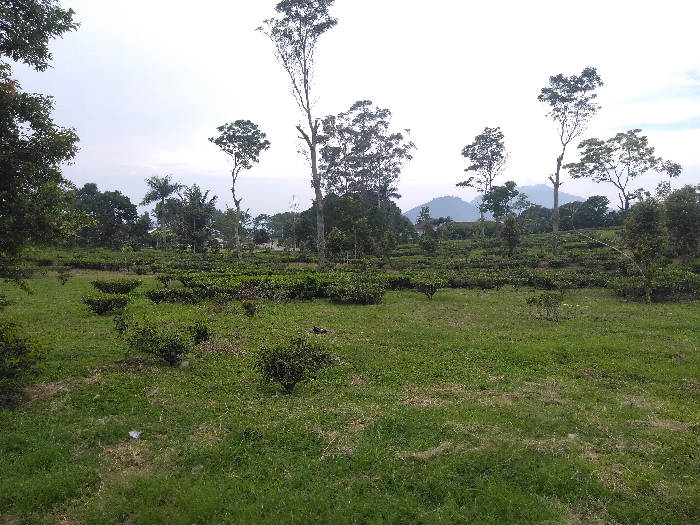 The image displays an outdoor, rural landscape under an overcast sky. The foreground consists of an uneven grassy field with patches of sparser vegetation and some exposed soil. In the midground, numerous rows of short, dense green bushes, consistent with tea plants, are cultivated across the terrain, extending from left to right and receding into the background. Interspersed among these cultivated rows and in the further background are several tall, slender trees with relatively sparse foliage, along with denser clusters of other tree types. In the far background, faint outlines of distant, undulating mountains are visible beneath a hazy horizon, partially obscured by atmospheric conditions. Indistinct structures, possibly buildings, are minimally visible amidst the distant foliage. No human figures or animals are present. No specific actions or interactions are depicted; the scene is static. Regarding the location in the city of Asse, Belgium: The visual evidence, including the prominent tea plantation, specific types of vegetation consistent with tropical or subtropical climates, and the presence of distant mountainous terrain, does not correlate with the typical geographical and climatic characteristics of Asse, Belgium, a region not known for tea cultivation. The scene is inconsistent with Asse, Belgium.