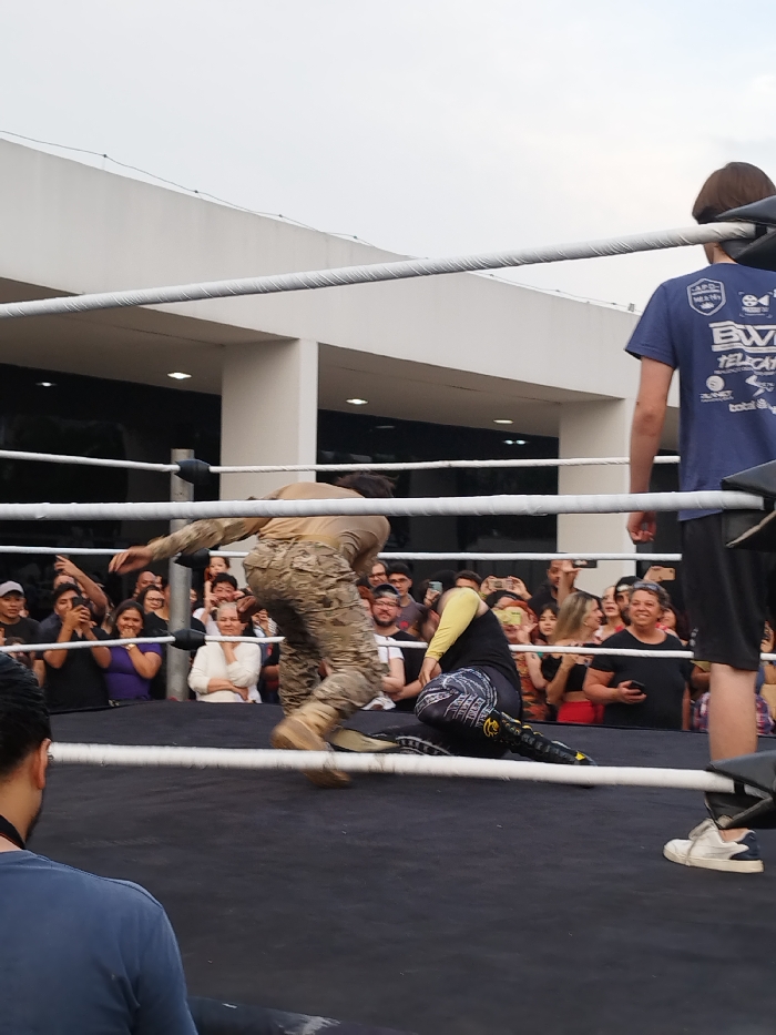 - "The image displays an outdoor professional wrestling match taking place within a roped ring, located in São Paulo, Brazil" by FM-ZqBmD2, licensed under CC BY 4.0
