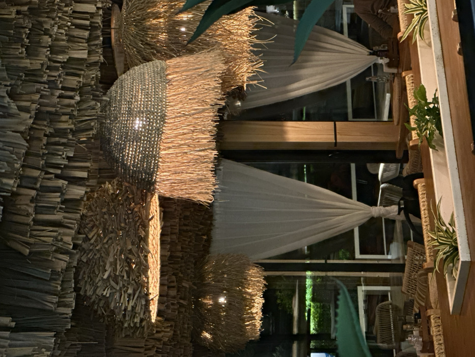 room decorated with woven and thatched elements. The wall is covered with stacked, textured materials. Several round light fixtures with fringed edges hang from the ceiling. White curtains are tied back, adding a soft contrast. Plants sit in rectangular planters along a wooden beam, adding a touch of greenery to the design. The reflection in the glass shows furniture and exterior elements.