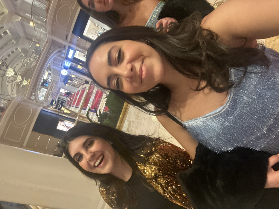 Three young women pose for a selfie indoors. The woman in the foreground wears a gold sequined jacket. The woman taking the selfie wears a light blue top with fringe. The background features an ornate interior with high ceilings, columns, and luxury store fronts. Red carpet can be seen in the distance. The overall impression is of a glamorous night out.
