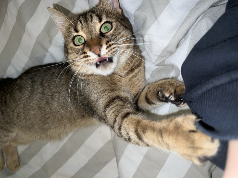 An indoor scene depicts a short-haired domestic cat, exhibiting a brown tabby coat pattern with dark brown stripes and patches, lying on its back and left side on a bed. The cat's head is tilted towards the viewer, featuring prominent green eyes with dilated pupils, white whiskers, and an open mouth with its tongue slightly protruding and pink gums visible. Its front left paw (from the cat's perspective) is extended forward, with visible claws partially engaged with a dark blue fabric, likely an item of clothing or a blanket. Its right front paw is also extended. The cat's body is stretched, displaying a light underside. The bedding consists of a duvet cover or sheet with alternating light grey and white vertical stripes. The background is out of focus, indicating a shallow depth of field. The lighting appears to be artificial, illuminating the cat's face. The depicted scene is located in a residential setting within the city of Beverwijk, Netherlands.