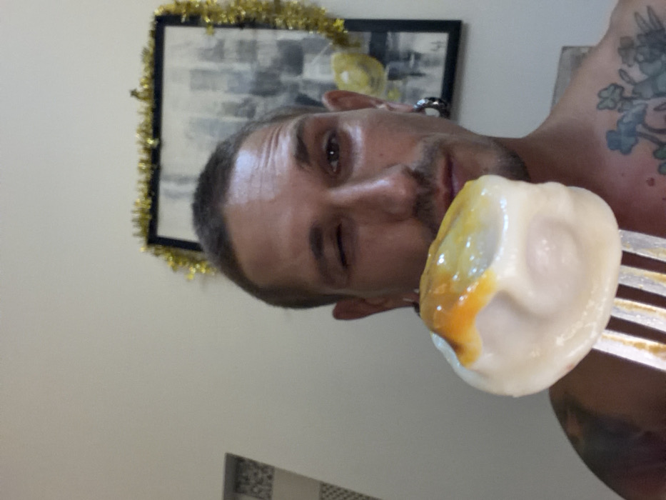 The image displays a close-up, chest-up view of an adult male in an indoor setting. The male, with short buzzed hair, a mustache, and stubble, wears earrings in both ears and has visible tattoos on his upper chest/shoulder and right arm. He is shirtless. His right eye is closed in a wink, his left eye is open, and his mouth is slightly pursed. A silver fork, holding a single piece of light-colored, irregularly shaped food topped with an orange-yellow sauce, is held in the foreground, obscuring part of his lower face. The background consists of a plain, light-colored wall. To the subject's left, a framed artwork depicting a monochrome cityscape is visible, adorned with golden tinsel around its frame. To the subject's right, a small section of a wall with patterned tiles is present. The specific location within Benoa, Indonesia, cannot be determined from the visual information provided.