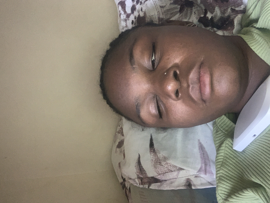 A single individual, an adult female with dark skin and dark braided hair, is depicted in a close-up, portrait-oriented image. She is lying down, positioned against a pillow with a light green, brown, and off-white abstract or floral pattern. The background consists of a plain, light beige wall. Her head rests on the pillow, and her face is directed towards the camera. Her eyes are partially closed; the left eye (viewer's right) is slightly ajar, while the right eye (viewer's left) is nearly shut, suggesting a sleepy or tired state. A small silver stud is visible in her right nostril. Two small silver hoop earrings are present on her visible left earlobe. She is wearing a light green, ribbed fabric garment. A white, elongated electronic device with rounded edges and a small dark rectangular detail is positioned on her lower neck or upper chest area. The image provides no identifiable information regarding its specific location within Tempure, Nigeria.