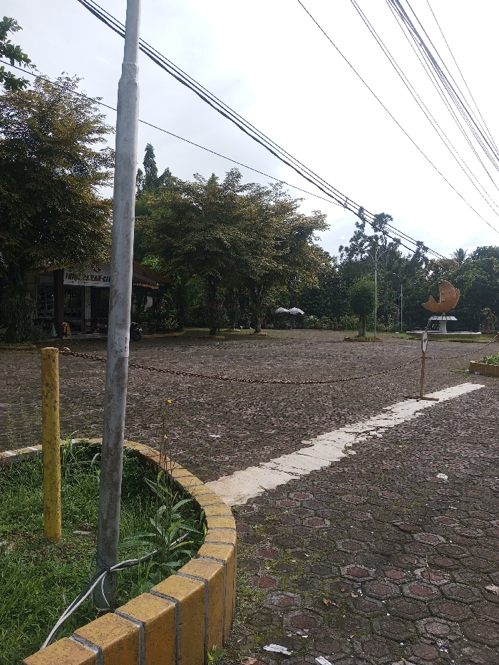 A wide-angle shot showcases a paved area with hexagonal stones. A low, curved wall of yellow bricks borders a grassy area with a pole, featuring plants growing around its base. A metal chain stretches across the open area. Trees surround the space, and a broken sphere-shaped sculpture rests on a pedestal in the distance. Power lines crisscross the sky above. A small building is also partially visible in the distance.