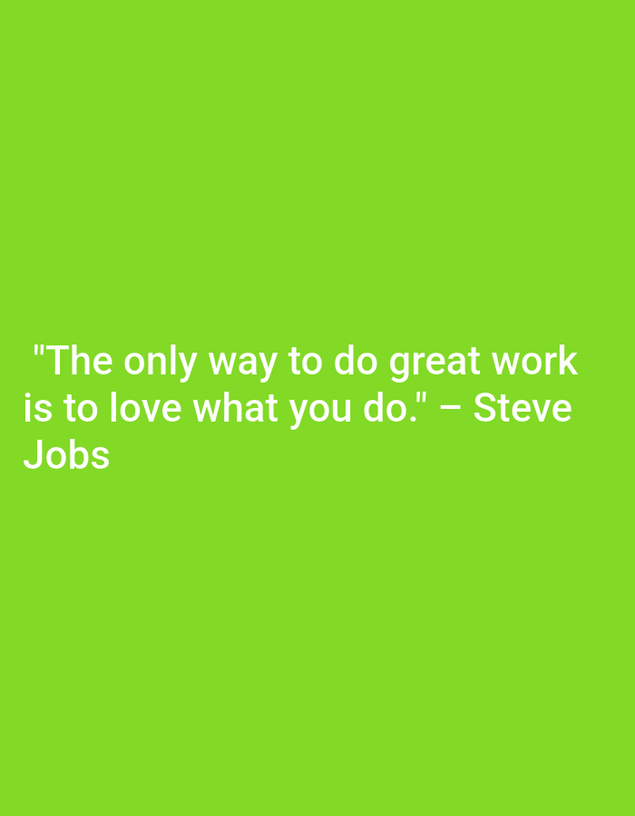 The image features a quote by Steve Jobs, set against a solid light green background. The quote reads, "The only way to do great work is to love what you do." The text is in a sans-serif font and is presented in white, creating a stark contrast against the background, which enhances readability. The quote is centered, with Jobs's name directly underneath the last sentence.