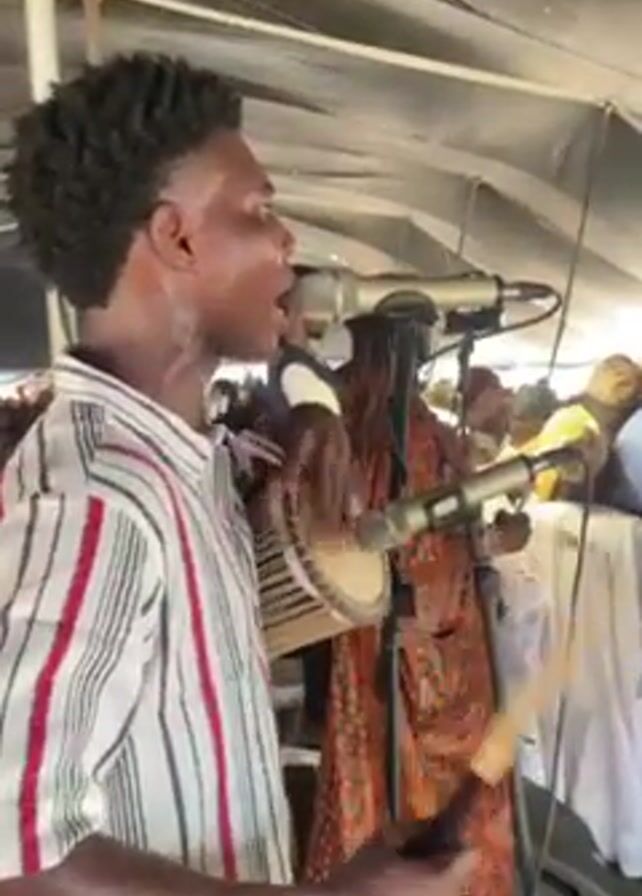 man playing a traditional drum, likely a tama or talking drum, in front of a microphone. He is wearing a white shirt with red and black stripes, and has short, styled hair. Another musician in an orange patterned outfit is standing behind him, also near a microphone. The setting appears to be under a tent or some kind of awning, with a crowd visible in the background.