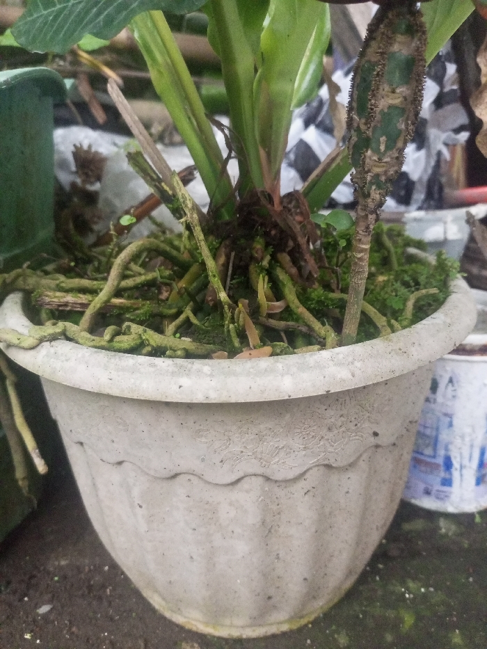 The scene depicts a weathered, light grey planter located in the city of Zee Pin Kone, Myanmar. The planter, likely concrete or ceramic, features a scalloped rim, an embossed floral or scroll pattern band below the rim, and vertical fluting on its body. It is discolored with dirt, green moss, and darker grey mottling. Within the planter, a plant with numerous exposed, gnarled roots is visible. These roots are heavily covered in vibrant green moss and some dry, brown fibrous material. Several green stems emerge from the root ball, supporting broad green leaves largely out of frame at the top. A distinct, elongated, dark green, spiky or tuberculate structure, covered in dry brown remnants, extends vertically from the root mass on the right side. The planter sits on dark, uneven ground, possibly dirt or concrete. In the blurred background to the left, a portion of a green plastic pot is visible. To the right, a partially obscured white bucket with blue markings and a crumpled white and black object are present. No people are visible, and no actions or interactions are depicted.