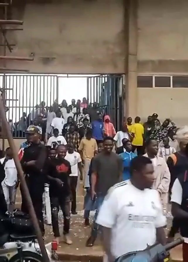 The video depicts a crowd of people gathered in front of a building with a gated entrance. The building appears to be a stadium or a large public facility. The majority of the people are young men, dressed in casual clothing. Some individuals are wearing hats or carrying items on their heads. Several motorcycles are parked near the entrance. The atmosphere seems to be bustling with activity, and people are moving in and out of the gate.