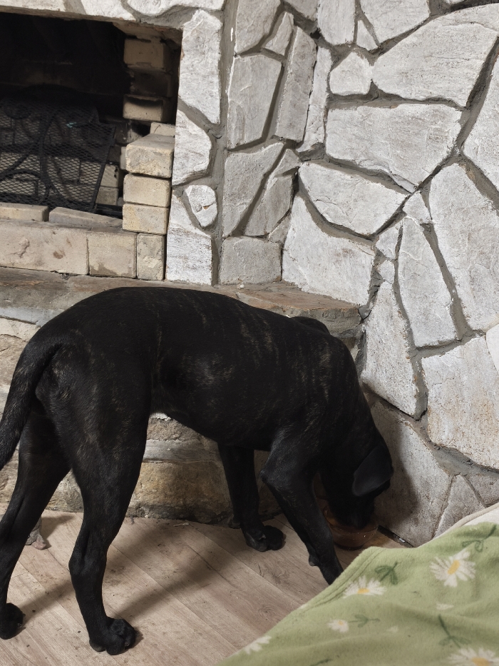 An interior scene in Avren, Bulgaria, depicts a dark-brindle dog with short fur, positioned in the lower-center of the frame. The dog is observed from its hindquarters to its head, which is lowered towards a small, brown bowl placed on the light-colored wooden floor. The dog's forelegs are bent, and its hind legs are straight. To the left and behind the dog is a fireplace structure. The fireplace opening, visible in the upper-left, is dark and contains a black metal grate. The hearth and lower portion of the fireplace are constructed from light-colored bricks, while the surrounding wall and upper section feature irregularly shaped, light-colored stone or stone veneer with dark grey mortar lines. A light-green textile with a repeating white daisy pattern is partially visible in the bottom right corner of the foreground.