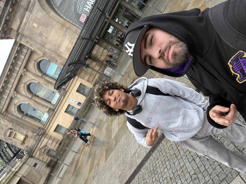 The image depicts two males posing for a selfie outdoors in front of Leipzig Hauptbahnhof in Leipzig, Germany