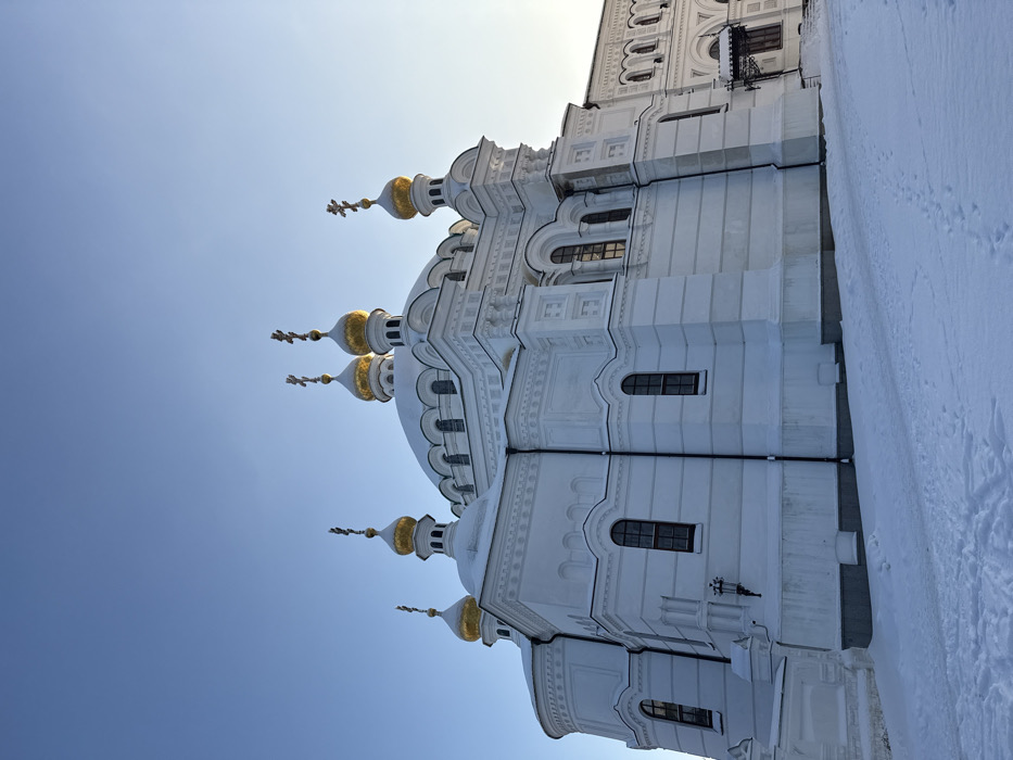 The image depicts the Dormition Cathedral (Uspensky Sobor) within the Kyiv Pechersk Lavra monastic complex, located in Kyiv, Ukraine. The grand, white Baroque-style cathedral stands prominently under a clear, light blue sky on a bright winter day. Five golden, onion-shaped domes, each surmounted by a golden Orthodox cross, are visible atop the cathedral's roof, with a dusting of snow on their upper surfaces. The white facade of the building features multiple ornate architectural details, including decorative pilasters, cornices, and numerous tall, dark-framed arched windows. The ground in the foreground is uniformly covered in a layer of untouched white snow, across which faint footprints and tire tracks are discernible. A dark, wall-mounted lantern fixture is visible on the lower left portion of the building's exterior. No individuals are present in the scene, and no specific actions or interactions are depicted.