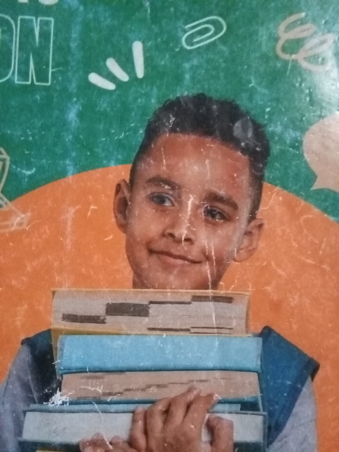 A close-up image shows a young boy smiling slightly, with a stack of books held in his arms. He is positioned against a backdrop featuring a green and orange color scheme with graphic elements like a speech bubble and a paper clip. The image appears to be a print or a poster, possibly related to education or literacy. There are visible signs of wear and tear, such as scratches and discoloration, adding a vintage feel.