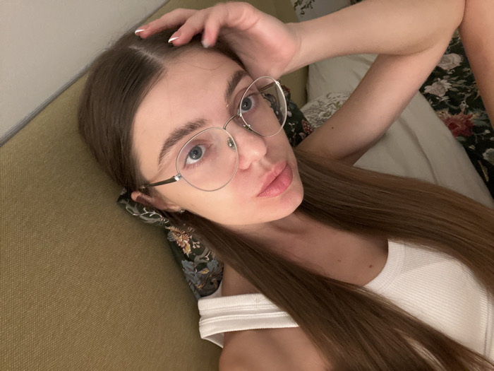 A fair-skinned woman with long, straight brown hair is lying down, gazing up at the camera. She is wearing round glasses and a white tank top. One hand is resting on her forehead, partially obscuring her hair. She appears to be lying on a patterned pillow on a couch, with floral bedding visible in the background. The lighting suggests an indoor setting.