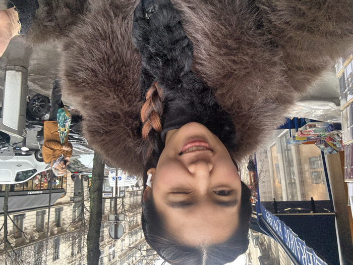 The image captures a street scene in Paris, France, under overcast conditions with a wet pavement. In the foreground, a young East Asian woman is featured prominently, taking a selfie. She is winking her right eye, smiling, and her tongue is slightly extended. She wears a thick, shaggy brown fur coat over a dark top, and a portion of her hair, styled in a braid with reddish highlights, rests over her right shoulder. A white wireless earbud is visible in her left ear. To the woman's left, an outdoor display of books or magazines, covered in clear plastic, is situated in front of a building with a dark blue awning bearing the inscription "LIBRAIRIE ANTIQUAIRE" (Antiquarian Bookstore). To her right, an older man with gray hair and a beard, wearing a light brown jacket and a scarf, stands on the sidewalk. He is holding a multi-colored patterned bag and appears to be speaking on a mobile phone. The street behind the main subject is damp, indicating recent rain. Various vehicles are present, including a dark SUV, a scooter, a white delivery van, and a white van marked "GAS." Across the street, a "Starbucks" coffee shop sign is visible. The background features typical multi-story Parisian buildings constructed in the Haussmannian style, characterized by light-colored facades, numerous windows, and balconies.