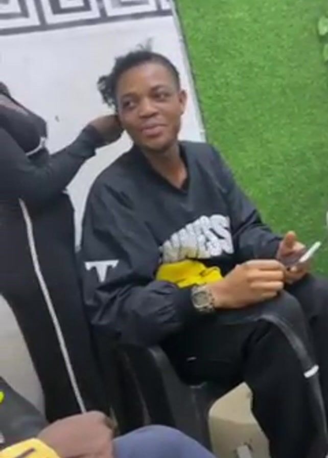A man is seated in a chair in a room, speaking and holding a smartphone. He is wearing a black jacket with white writing, black pants, and a watch. A woman stands behind him, styling his hair with a green comb. She is wearing a black jumpsuit with a white stripe down the side. Two other people are partially visible in the foreground, seated near the man. One wears a yellow patterned shirt, and the other wears blue pants. The room has a wall with a geometric pattern, and a green wall decoration that looks like leaves. There is also what appears to be a pair of scissors on a seat. The man smiles as the woman styles his hair.