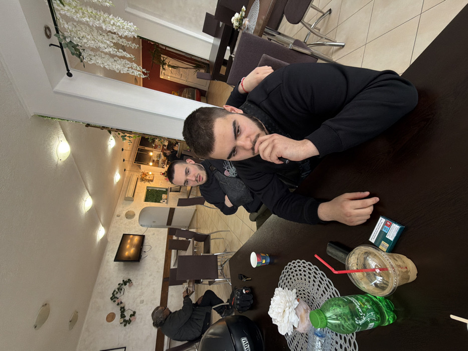 The scene depicts the interior of a cafe or restaurant in Zheleznitsa, Bulgaria. In the foreground, a dark brown table holds a black motorcycle helmet, a small white decorative flower on a placemat, a green plastic bottle of "Carbonated Soft Drink," a clear plastic cup with a light brown beverage and two red straws, a dark object resembling a phone or vape, and a pack of Marlboro Fusion Blast cigarettes. Two young adult males are seated at this table. The man closest to the camera, on the right, has dark hair and a beard, wears a black long-sleeved shirt, and is looking downwards with his right hand resting on his chin. The man behind and to his left has short dark hair and a light beard, wears a black top with a black fanny pack/sling bag, and is looking directly towards the camera. His right arm is draped over the back of the first man's chair, with a red string bracelet visible on his wrist. The midground and background reveal more of the cafe interior, featuring multiple dark brown tables with light brown chairs. On the far left, an older person with long grey hair, dressed in a dark jacket, is seated at a table, appearing to interact with an item. The light-colored walls are decorated with wall-mounted lights, a television displaying an image, and artificial floral garlands. An archway leads to another section of the establishment, where additional tables, decorative lighting, an air conditioning unit, and vague figures of other patrons are visible. A prominent white structural beam on the right supports hanging artificial white wisteria flowers. A red wall section and a plant are visible through a doorway on the far right. The ceiling is light-colored with various lighting fixtures, and the floor appears to be light-tiled. The environment is well-lit.