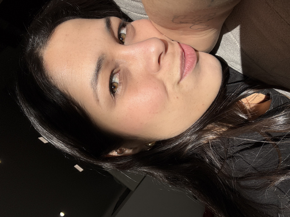 A close-up image captures a female individual, likely in her mid-20s to early 30s, in an indoor setting within the city of Barcelona, Spain. The subject has long, dark hair, brown eyes, and a light to medium skin tone. She is depicted with a subtle, closed-mouth smile, looking directly at the viewer. Her face is illuminated by strong natural light from the left, casting a soft shadow on the right side of her face and neck. She wears a dark-colored top. Her left ear is visible, adorned with a gold hoop earring and a smaller stud earring. Her head is partially resting against a light grey, textured fabric surface, possibly a pillow, sofa armrest, or another person's shoulder. A faint, outline-style tattoo is visible on the inner surface of the grey object, suggesting it may be a human arm or shoulder. The background is dark and out of focus, revealing hints of interior architecture and what appear to be overhead light fixtures.
