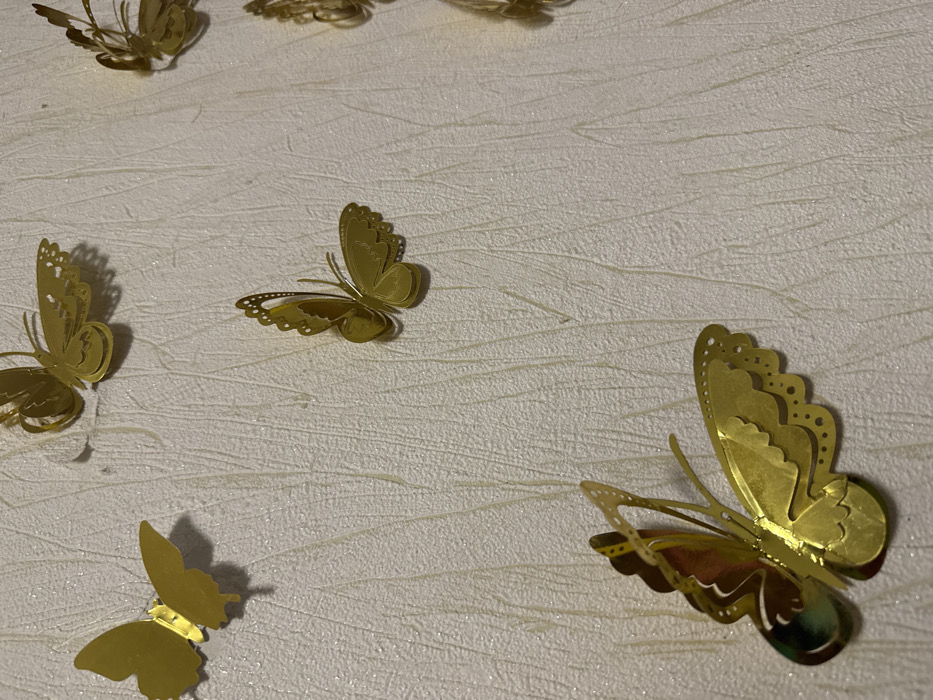 The image displays an interior wall surface adorned with multiple golden, metallic butterfly-shaped decals