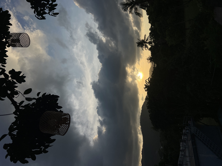 This image captures a tropical landscape at sunset or sunrise in บ้านบางรักษ์, Thailand. The sky is largely covered by dark grey and blue-grey clouds, with a bright golden-yellow sun positioned low on the horizon, partially obscured by clouds and distant mountains. In the upper foreground, silhouetted tree branches with leaves extend into the frame, from which two light-colored, cylindrical lanterns with perforated patterns are suspended. The midground features a dark, undulating mountain range against the horizon, below which a dense canopy of dark green tropical trees and foliage is visible, including multiple distinct palm tree silhouettes. In the lower-left, a section of a concrete rooftop with visible external air conditioning units and a metal staircase is present. The scene is strongly backlit, creating pronounced silhouettes of all foreground and midground elements. No individuals or specific activities are observed.