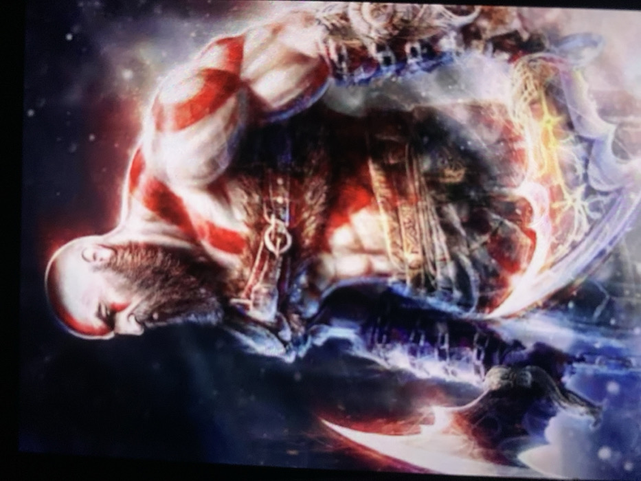 A digital artwork depicts the character Kratos, a powerfully built, bald male with a dark beard and distinctive red tribal tattoos on his face (extending from his left eye across his brow), chest, and left arm