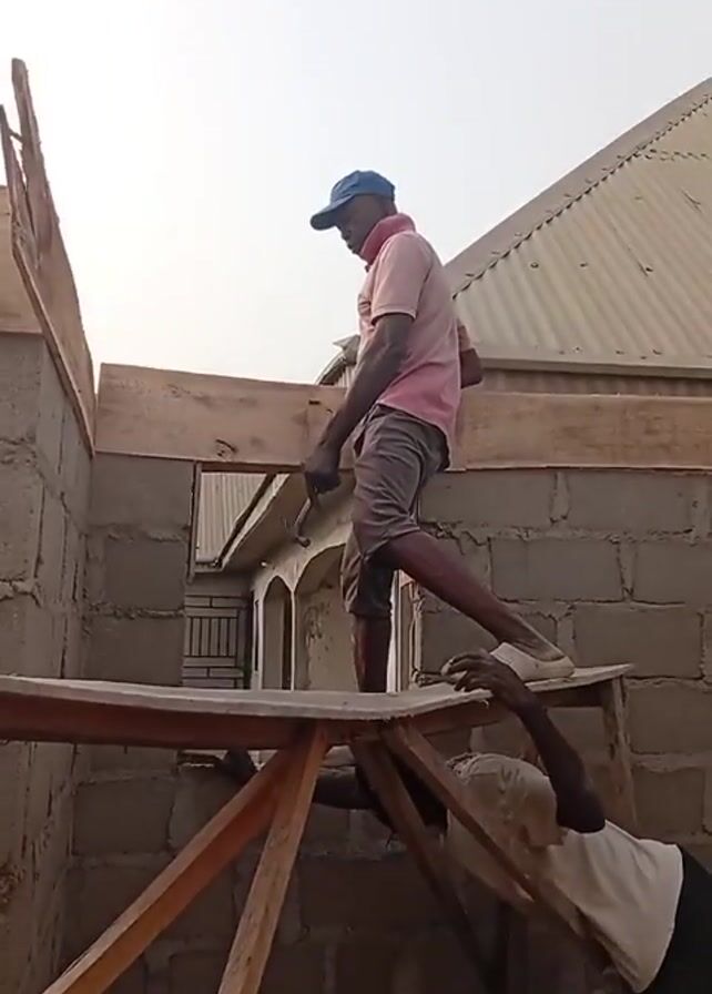 Two men are working on a construction site. One man, wearing a pink shirt, shorts, and a blue cap, is standing on a wooden scaffolding. He's holding a hammer and appears to be working on a wooden beam atop a block wall. The other man, wearing a white shirt, is positioned below on the scaffolding and reaches up to hand the man on top a brick. The building appears to be partially constructed with exposed concrete blocks. In the background, there's another building with a corrugated metal roof. The sky is overcast and bright.