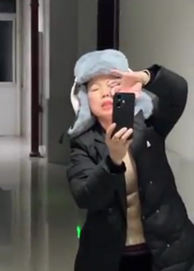 A woman stands in a long, brightly lit hallway taking a selfie with a smartphone