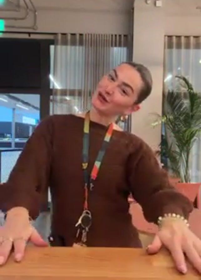 Here's a detailed description of the video: A woman with her hair pulled back greets the camera with a "Good morning, chats!". She is wearing a brown sweater and a colorful lanyard around her neck. The woman presents a drink in a clear plastic cup with a red and white straw. The woman places her hands flat on the wooden surface in front of her. She is standing at a counter or table in what appears to be a modern office or workspace. Behind her, there's a glass-enclosed area with chairs and a plant. The lighting is bright and neutral. A green "exit" sign is visible above a doorway. The room has light-colored walls, and the ceiling is exposed with visible pipes and lighting fixtures.